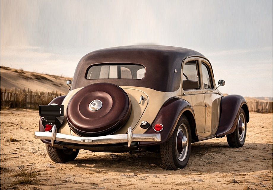 Très élégante Citroen Traction bicolore avec un intérieur lumineux. La Traction est la voiture préférée des Mariés.